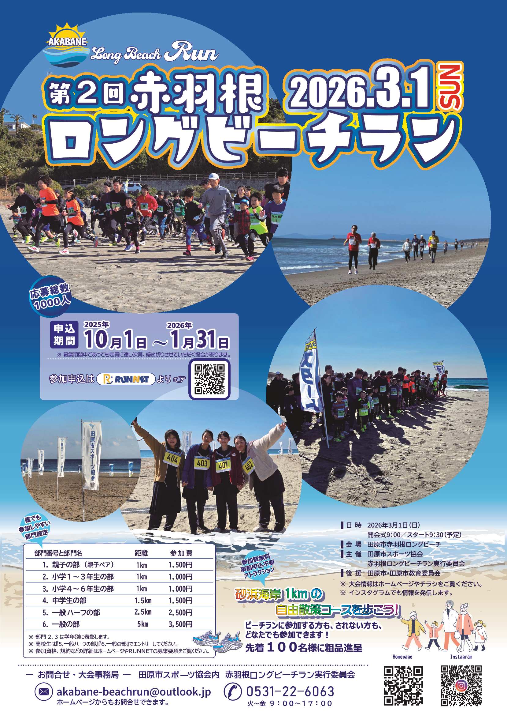 田原市スポーツ協会、赤羽根ロングビーチラン実行委員会が主催する「第2回赤羽根ロングビーチラン」のチラシです。令和8年3月1日(日)に赤羽根ロングビーチにて開催されます。 |