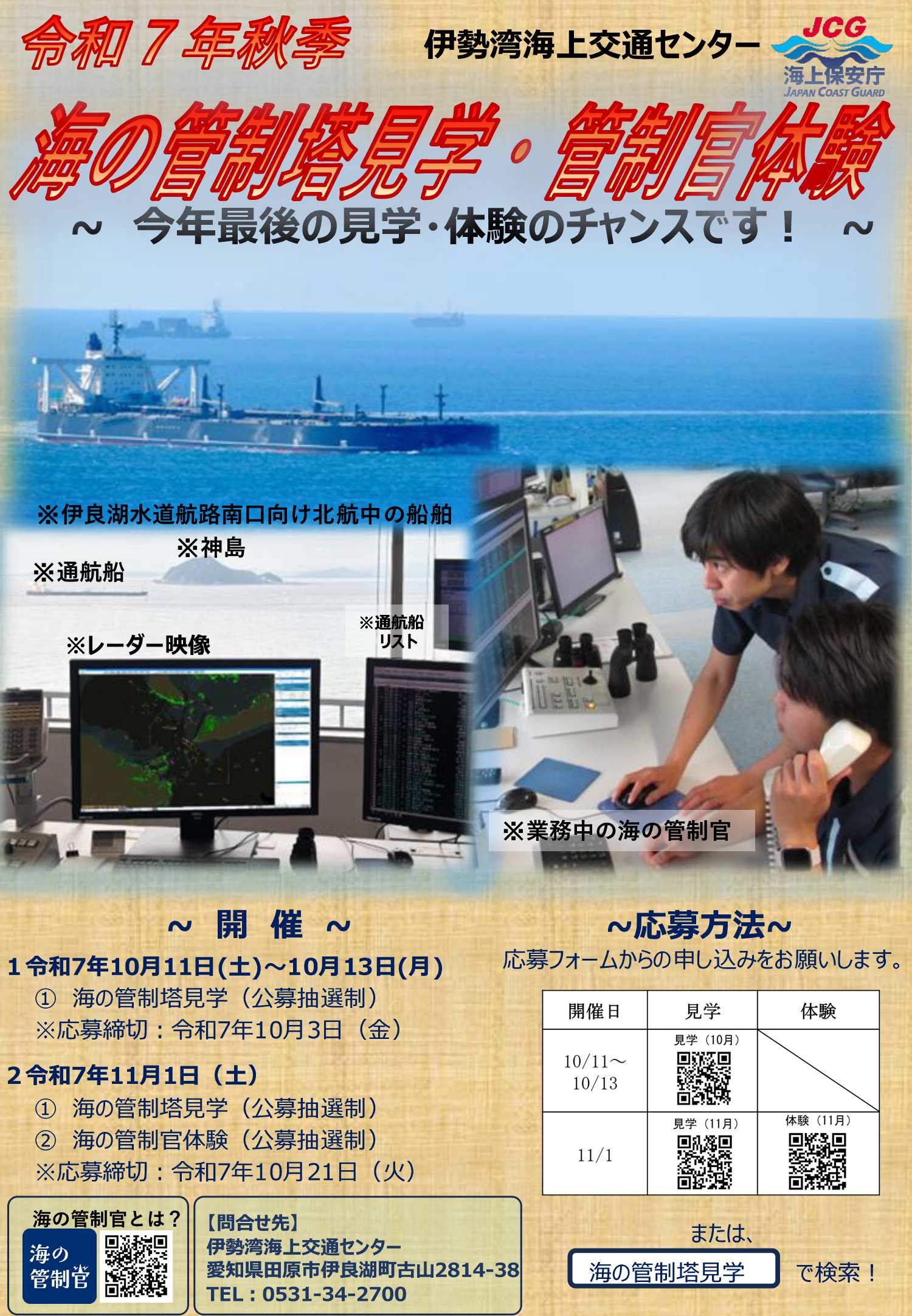 伊勢湾海上交通センターが主催する「伊勢湾海上交通センター見学・体験」のチラシです。10月11日(土)から10月13日(月)に開催されます。 |