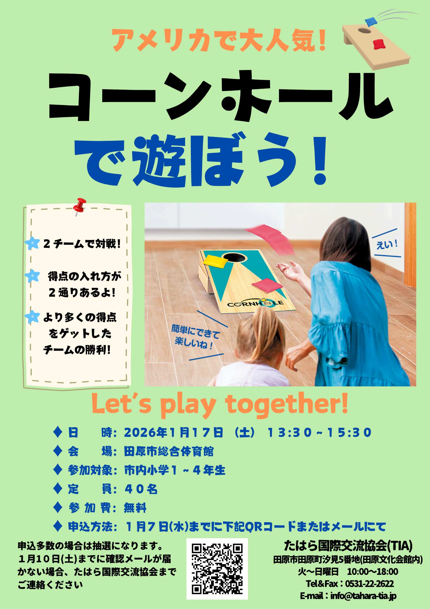 たはら国際交流協会(TIA)が主催する「コーンホールで遊ぼう!」のチラシです。1月17日(土)に田原市総合体育館にて開催されます。 |