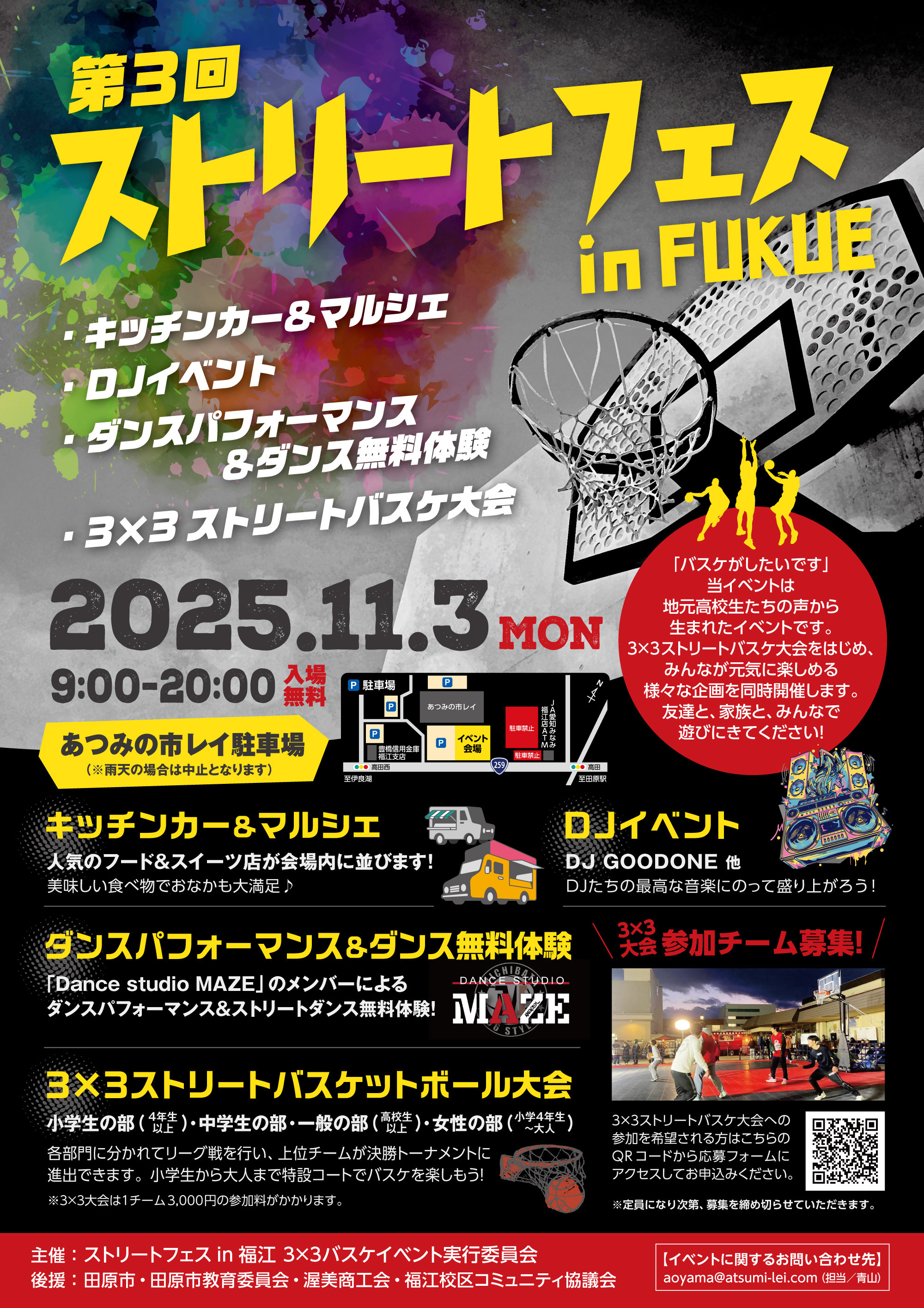 ストリートフェスin福江3×3バスケイベント実行委員会が主催する「第3回ストリートフェスinFUKUE」のチラシです。11月3日(月)にあつみの市レイ駐車場にて開催します。 |