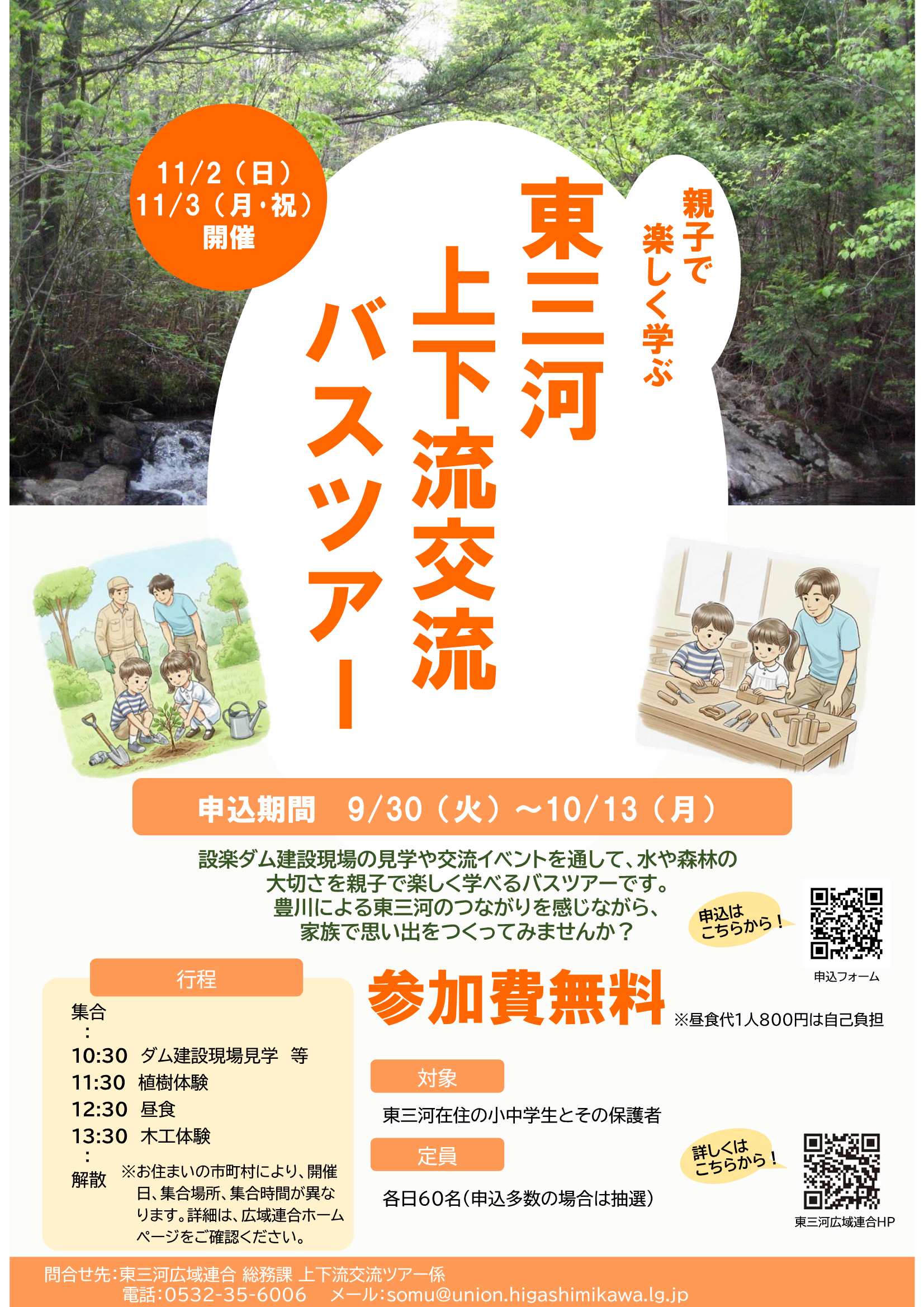東三河広域連合が主催する「上下流交流バスツアー」のチラシです。11月2日(日)、11月3日(月)に開催されます。 |